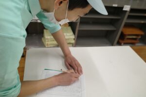 午前中は単純な菓子箱折などの作業を通じ、職場での基本的なルールやマナーを学びます。午後は分担清掃と呼ばれる、食堂・階段・居室・トイレなど、一つの場所を一人で清掃できるように段階を追って学ぶクラスです。最終的には一つの作業を最後まで任せられるようになる事が目標のクラスです。