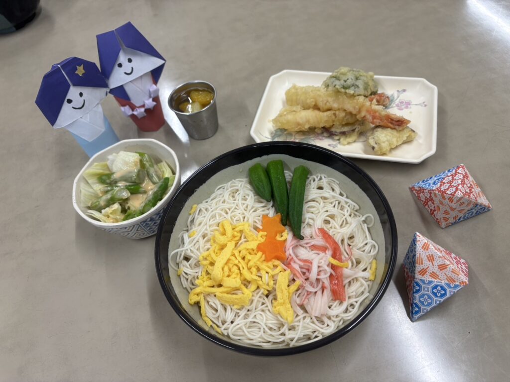七夕そうめんに、天ぷらの盛り合わせ、七夕フルーツゼリーとアスパラサラダです。