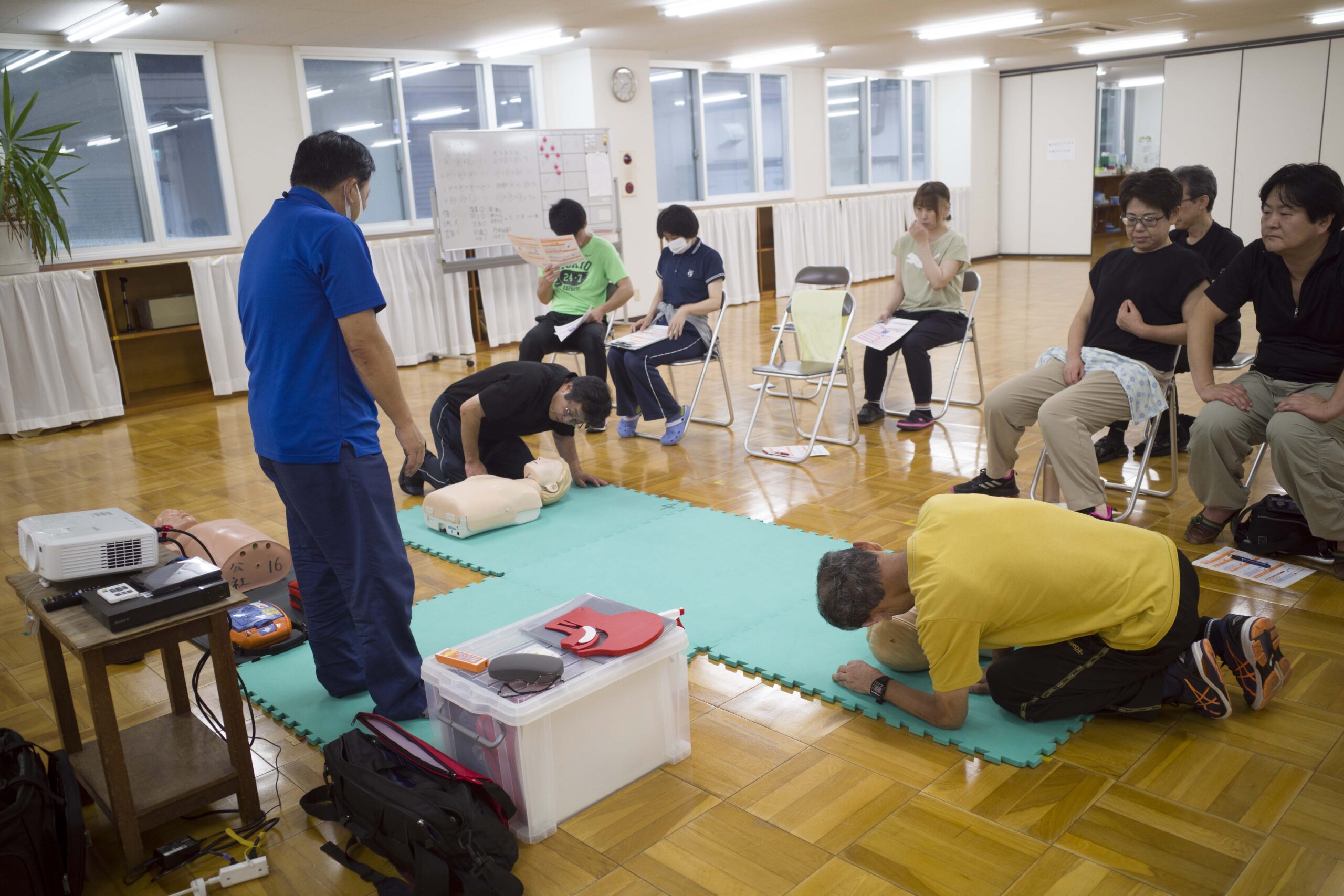 AEDは心臓の痙攣(心室細動)を止めるためのものであり、電気ショック後も心肺蘇生を続けることが重要であること、ためらうことなくAEDを使用すること。できるのであればプライバシーに配慮して救命活動を行う方法などを丁寧に教えていただきました。