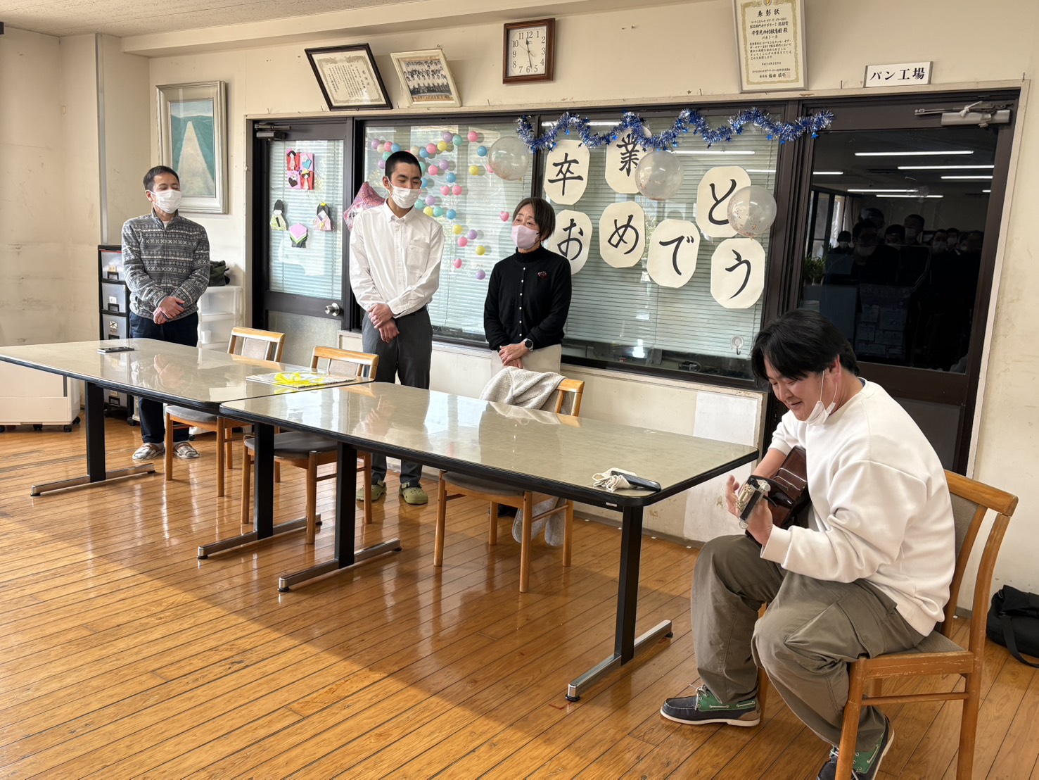 一人ひとりがノートに書いた言葉を練習し、本番ではノートを見ずに語りかける姿は、Sさんへの真心を伝えるものでした。その気持ちがっかりと届いたことと思います。また、職員によるギターの生演奏のプレゼントもありました。