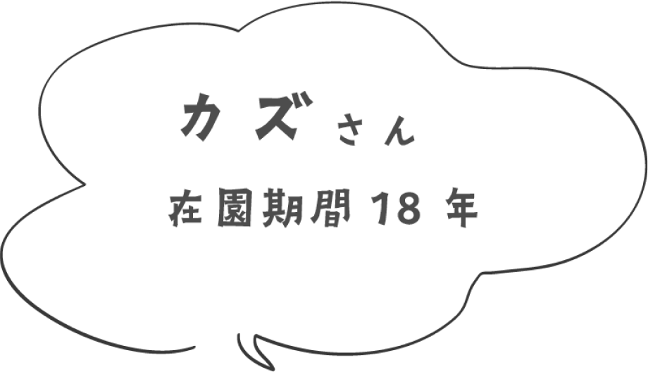 入園前のカズさんの状況をご両親に訊ねるとこれといって思い出せず、何もしない(何もできないと思い込んでいた)お子さんだったようです。中学3年生の時、てんかん発作を起こすようになり、体を動かす機会も少なく、夜の寝付きも悪くて朝も起きられないお子さんだったそうです。中学校卒業後に特別支援学校の高等部へ進学しましたが、頻繁に発作を起こすようになり、学校に馴染めない状態でした。これ以上、高等部に在籍していても意味を見出せないことと、卒業後の進路に不安を抱き、光の村へ相談に来てくださいました。その後、入園するにあたり高等部は中退し、18歳の誕生日に仮入園。約1ヶ月後に正式に入園されました。入園直後は園の活動を嫌がり押し入れに隠れて逃げてしまい、なかなか変化の兆しが見えませんでしたが、ご両親も諦めず、大変ご熱心に関わり続けてくださったことで、一年程経過した頃、徐々に変わり始めました。