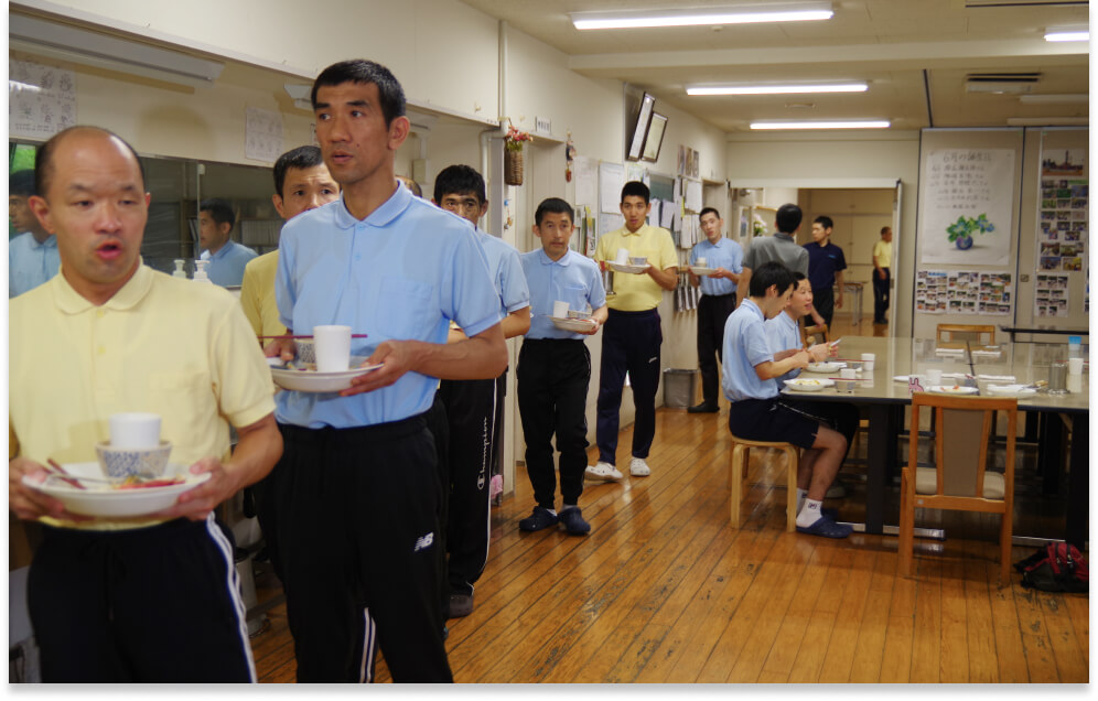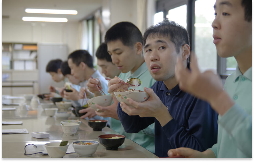 一日3回提供される食事は、園生が楽しみにしている時間でもありますが「暮らしの学び」の一環として、食べ方と歯磨き指導を行う学びの時間でもあります。入所前に暴飲暴食を繰り返し、肥満や体重超過による成人病一歩手前・疾患を抱えた状態で入園する園生も少なくありません。規則正しい食事習慣は社会人として大切な要素の一つです。ここでは、園内の調理室で作られる手作りご飯と、食後に必ず行う歯磨き指導の様子を紹介します。