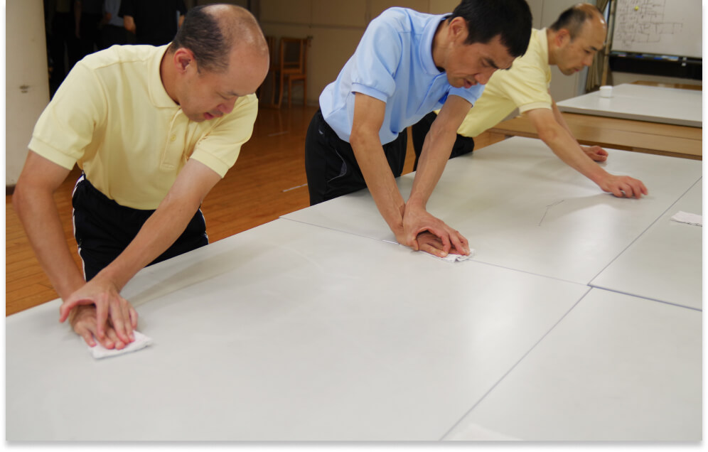 食後は、園生達が余暇の時間に手作りしている刺し子の台拭きでテーブルをきれいに拭いていきます。1/4の大きさの台布巾を、両手でしっかり抑えて「1234・・」と数えながら往復させます。大きなテーブルでも拭き残しが無いよう、隅々まできれいに拭きます。