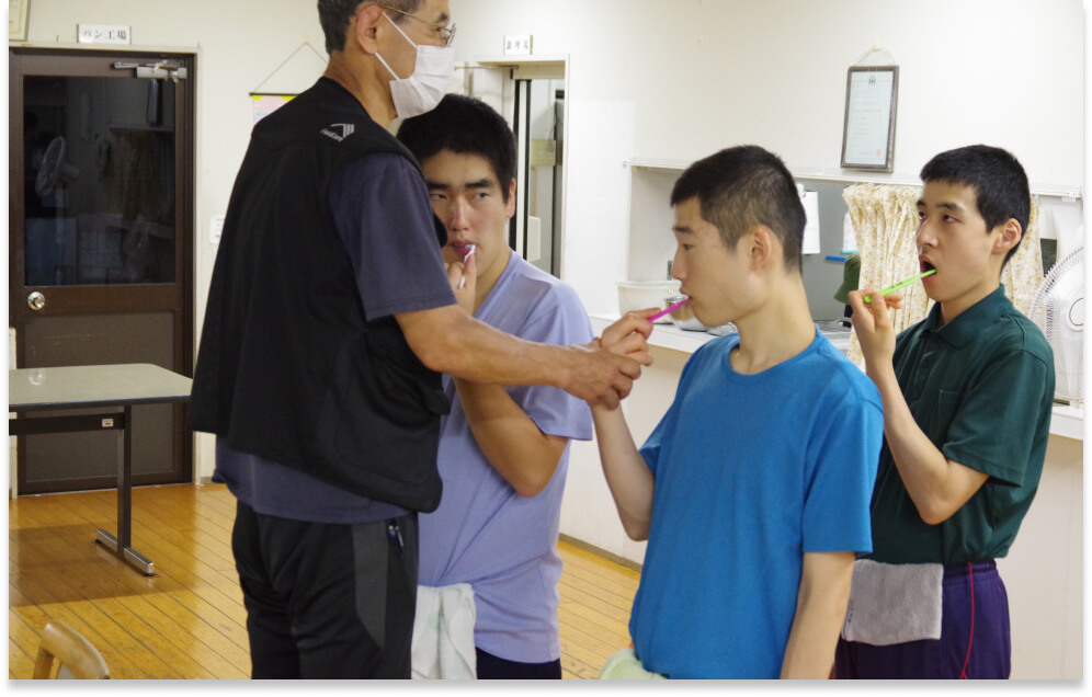 口の中の健康は、全身の健康度を上げる重要な要です。良く噛む事で唾液の分泌が促され、口臭の抑制につながり、胃腸の消化も助け、肥満の防止にもなります。園生達は、一本一本の歯を順番に磨き、いつまでもしっかり噛める歯を維持できるよう、3回の食事毎に歯磨き指導を受けています。