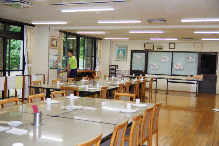食事が終わると、グループ別に調理室のカウンター前に並びます。箸や小鉢・汁椀を分けて返却します。ラップなどのゴミ類は、カウンター前のゴミ袋へ捨てましょう。調理をしてくれたスタッフの皆さんにも「ごちそうさまでした」のご挨拶を忘れずに。