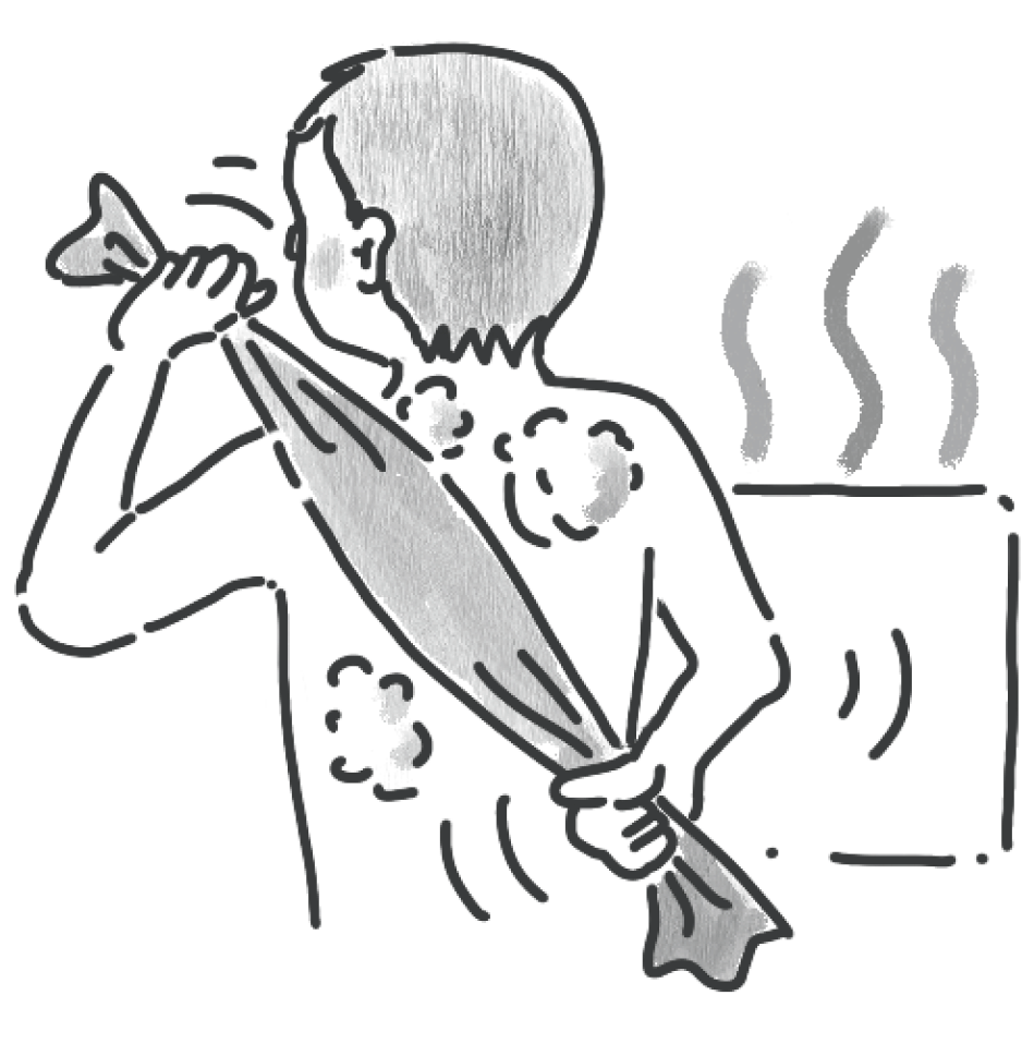 人の体は複雑な形をしています。自分の手で、隅々まで衛生的に保てるよう「頭・首・腕・手・胸・腹・背中・脇・尻・股・脚・足」それぞれの部位別に手順をしっかり教え込みます。1、2、3.....みんなで数を数えながら、洗い残しがないよう、垢すりの持ち方から支援します。最後は自律神経や疲労回復効果の高い温冷浴を、水とお湯で交互に8回繰り返します。上がる頃には血行が良くなり、体がポカポカしてきます。