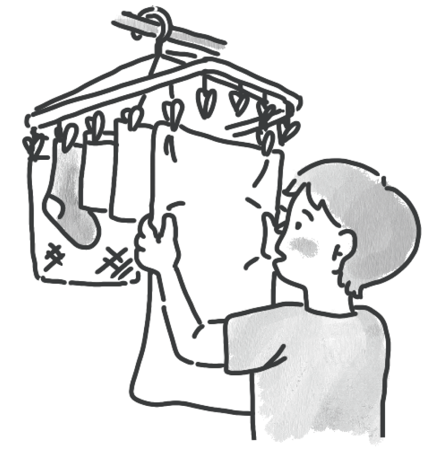 パンツ・靴下・手拭きタオルを、洗濯板を使って洗います。手順通りに丁寧に洗えば、汚れもすっきり落ちています。指先に力を入れる事が苦手な彼らでも、洗濯板を使うことで、絞る・折り込む・しわを伸ばすなどの動作に力が入り易くなり、毎日繰り返す事で腕の力、手首の柔軟性が向上する機能訓練となります。